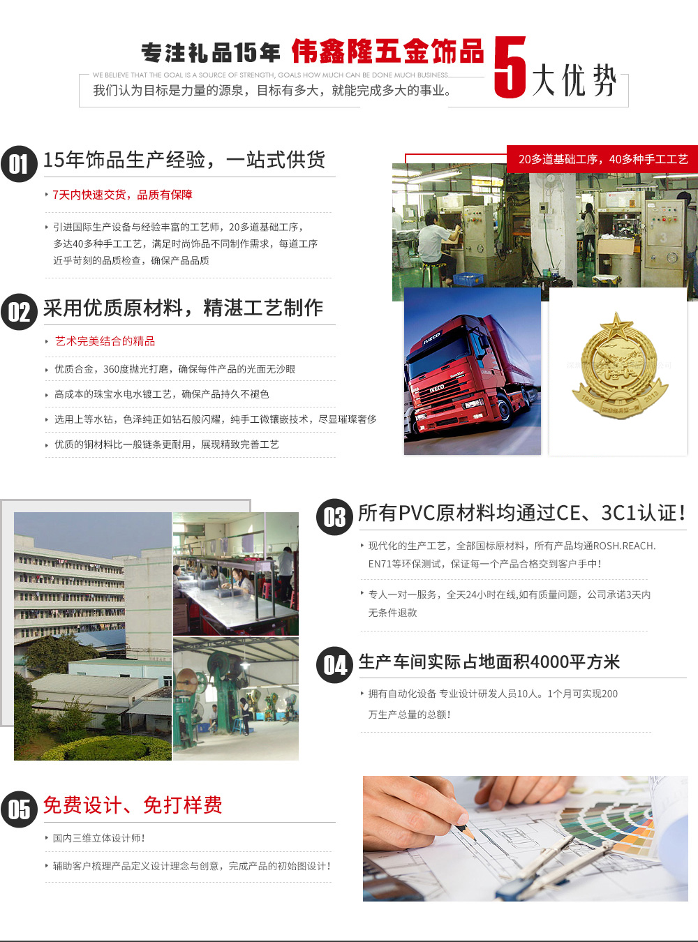 深圳市偉鑫隆五金飾品有限公司位于廣東省深圳市坑梓鎮(zhèn),是一家集設(shè)計(jì)、生產(chǎn)、銷售為一體的專業(yè)五金禮品工藝公司。 公司擁有經(jīng)驗(yàn)豐富的專業(yè)技術(shù)精英團(tuán)隊(duì),至今已有十多年設(shè)計(jì)生產(chǎn)經(jīng)驗(yàn)。 公司自有工廠引進(jìn)先進(jìn)的臺(tái)灣設(shè)備及技術(shù),擁有設(shè)計(jì)、繪圖、制模、沖壓、壓鑄、拋光、電鍍、包裝等生產(chǎn)流程,可生產(chǎn)銅、鐵、不銹鋼、鋁、鋅合金、鉛錫合金等材質(zhì)的金屬徽章、胸針、胸章、獎(jiǎng)?wù)隆ⅹ?jiǎng)牌、金屬標(biāo)牌、工號(hào)牌、金屬鑰匙扣、狗牌、軍牌、開(kāi)瓶器、金屬手機(jī)吊飾、錢夾、領(lǐng)帶夾、帽夾、項(xiàng)鏈吊墜、掛包鉤、紀(jì)念章、紀(jì)念幣、袖扣、促銷禮品鑰匙扣、書(shū)簽、五金配件、開(kāi)瓶器等旅游紀(jì)念品及工藝禮品五金飾品。我公司還可根據(jù)客戶樣板開(kāi)模生產(chǎn)。 公司秉承“精...